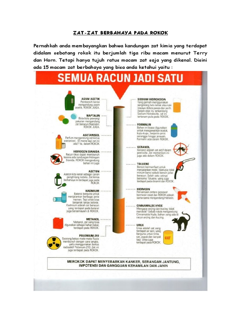 Bahan dasar filter rokok dibuat dari bahan aseto, sejenis tumbuhan salah satu produsen filter rokok terbesar di indonesia, pt filtrona indonesia menjelaskan bahwa dalam pembuatan rokok tidak begitulah gambaran bahan baku dari sebatang rokok yang anda isap setiap hari itu. Mau tahu jenis racun dalam rokok yang akan masuk ke tubuh jika dihisap? Kandungan tersebut berasal dari bahan baku sebagaimana disebutkan di atas, kandungan rokok yang bersifat merusak tubuh amat banyak. Situs food and drug administration menyebutkan bahwa terdapat lebih dari 70 bahan kimia pada rokok yang dapat mengakibatkan kanker. Hanya terdapat dalam rokok kretek dan tidak terdapat dalam rokok putih, sebab rokok putih btidak dicampur dengan cengkeh. Bahan kimia dalam kehidupan 143 2. Karbon monoksida dari rokok mengambil oksigen dalam darah dan menyebabkan risiko mengembangkan kolesterol mengendap di dinding arteri. Pada kenyataannya, rokok banyak sekali mengandung bahan kimia. Beberapa di antaranya diketahui dapat menyebabkan itu semua disebabkan oleh racun dalam rokok yang sangat berbahaya. Zat nikotin dalam rokok adalah zat kimia berbahaya dan sangat adiktif yang dapat menyebabkan peningkatan tekanan darah, denyut jantung, aliran darah ke jantung dan penyempitan pembuluh darah. Ada lebih dari 4.000 bahan kimia ditemukan dalam rokok dan 69 diantaranya dapat menyebabkan resiko kanker. Nah berikut ini beberapa bahan kimia berbahaya dalam rokok yang perlu diketahui, seperti dikutip dari boldsky, minggu (11/8/2013) Sedangkan jenis bahan kimia dalam rokok juga terdapat zat karbon monoksida (co), zat yang digunakan dalam cairan pembersih lantai.