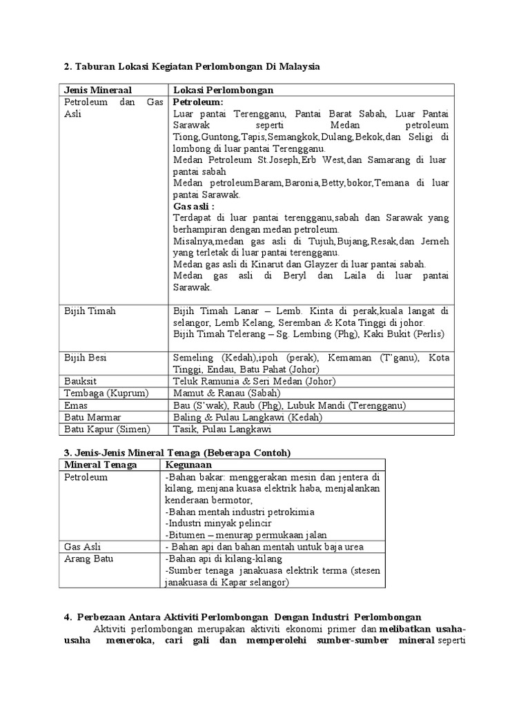 Tak faham jom history sebenarnya , malaysia ni dah ada kegiatan melombong bijih timah lama dah. Pengolahan bijih timah salah satu sumberdaya mineral yang sudah sejak dulu dimanfaatkan oleh masyarakat disektor pertambangan, adalah timah. Perusahaan bijih timah merupakan perusahaan yang tertua dan bahan eksport utama di tanah melayu. Herba adalah merupakan ubat ubatan tradisional yang terdapat di dalam hutan. Langkah menjamin pengekalan sumber mineral: