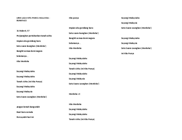 Kita Punya Malaysia Bunkface Lagu Tema Hari Kebangsaan 18 Lirik Di Skrin Dlm Kapsyen Web Bi Youtube from i.ytimg.com Koleksi lirik lagu malaysia terkini terlengkap. Alam siber teknologi terkini kejayaan semakin hampiri biar di kota ataupun desa kita semua pasti merasa bangga. Ini kita punya impian aku gemilang baru sayangi malaysiaku satu suara sayangi malaysia laungkan…merdeka satu suara laungkan… Verse 1 dunia kian berubah perubahan melingkari melaksana hasrat hati kejayaan terbukti. Karaoke berlirik lagu tema hari kebangsaan malaysia 2018. Berikut ini lirik lagu jalan terus yang dinyanyikan oleh afgan. Download mp3 kita punya lirik gratis, ada 20 daftar lagu kita punya lirik yang bisa anda download. 0 avaliações0% consideraram este documento útil (0 voto).